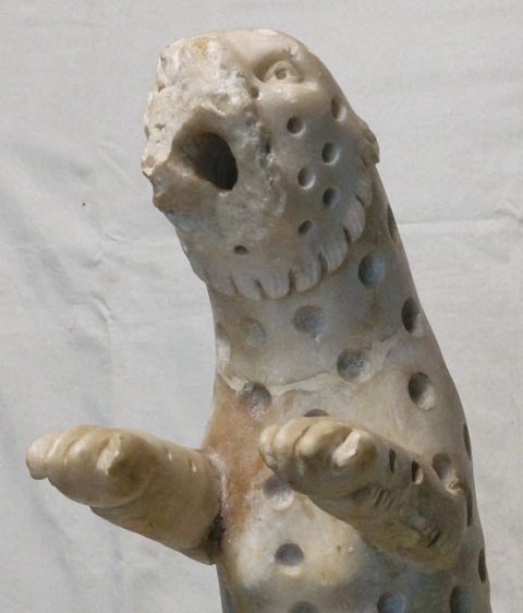 - Schnauze abgebr., Bruch durch den Hals, Bohrung für Wasserrohr im Maul