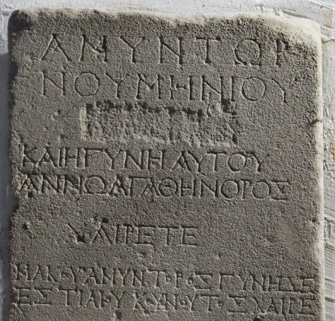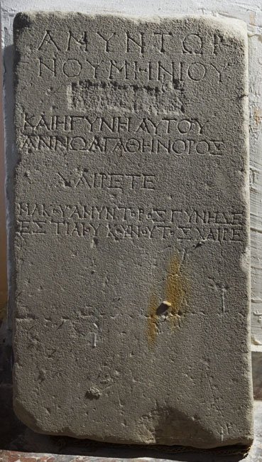 Ἀμύντωρ / Νουμηνίου / [χαῖρε]〛/ καὶ ἡ γυνὴ αὐτοῦ / Αννω Ἀγαθήνορος / χαίρετε./ Μακου Ἀμύντορος, γυνὴ δὲ / Ἑστιαίου Κουνουτος χαῖρε.