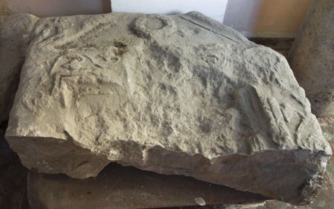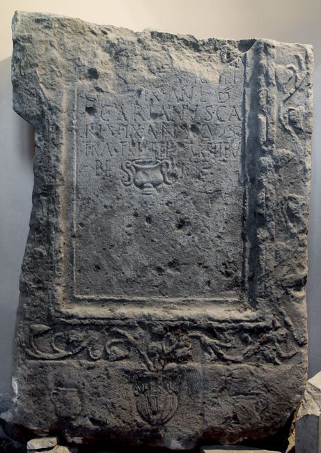 - Eingeschriebener Giebel mit Kranz. Auf dem Rahmen der Inschrift Efeuranken, die aus einem Krater wachsen. Seitlich des Kraters zwei weitere Gefäße. In der letzten Inschriftzeile Gefäß mit Volutenhenkeln.