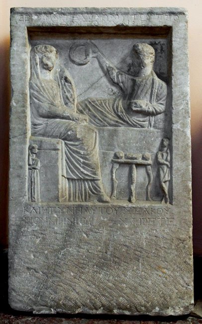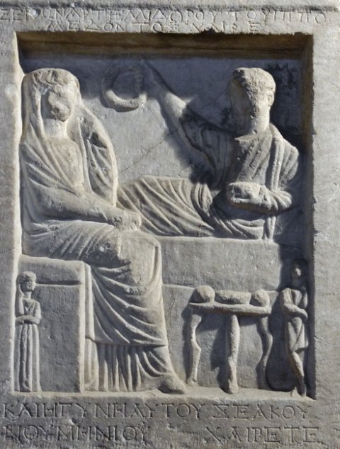 - Totenmahl: Mann auf Kline, in der Rechten Kranz, in der Linken Becher. Frau auf Hocker, links Dienerin, rechts Diener. Tischchen mit Speisen.