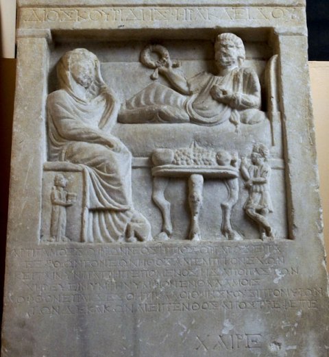 - Totenmahl: Mann auf Kline, in der Rechten Kranz, in der Linken Becher. Frau auf Hocker. links Dienerin, rechts Diener. Tischchen mit Früchten. Ungerahmter Giebel mit Seitenakroteren.