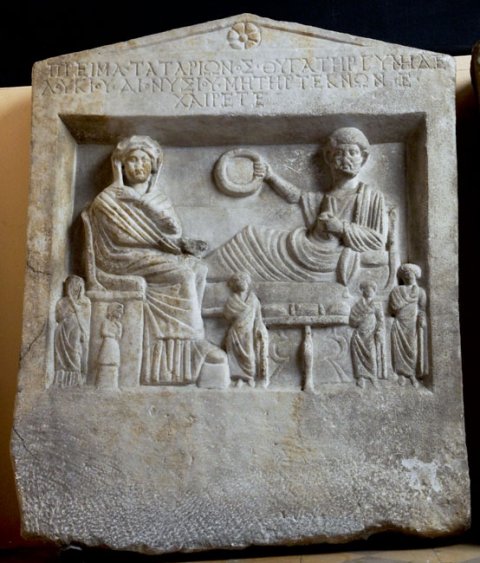 - Totenmahl: bärtiger Mann mit Kranz in der Rechten auf Kline, Frau auf Lehnstuhl mit Fußschemel. Unter dem Stuhl kleine Dienerin. Tischchen mit Speisen. Kinder: links Tochter, in der Mitte ein Sohn, rechts zwei Söhne.