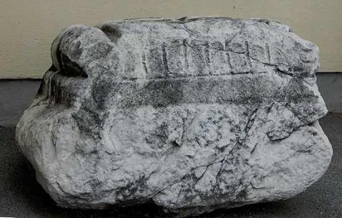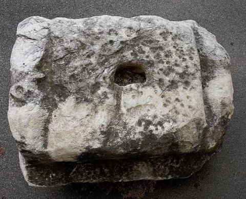 - unten abgemeißelt, stark besch., oben Dübelloch