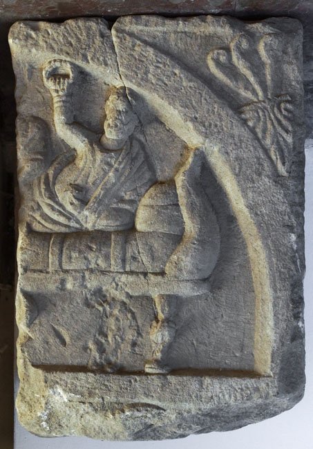 - Bogenfeld mit Totenmahl: Kline mit bärtigem Mann, in der erhobenen Rechten Kranz. Neben ihm Schulter einer weiteren Person. Unter der Kline Spuren einer Dienerfigur und Rest eines Tischchens. Im Zwickel über dem Bogen Palmettenornament.