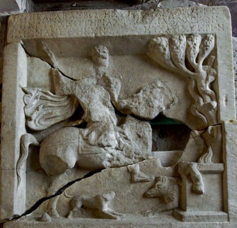 - Mythische Figur: Heros Karabasmos (Thrakischer Reiter), vor ihm Altar und Baum mit Schlange, unter dem Pferd Hund, hinter dem Altar auftauchender Eber.