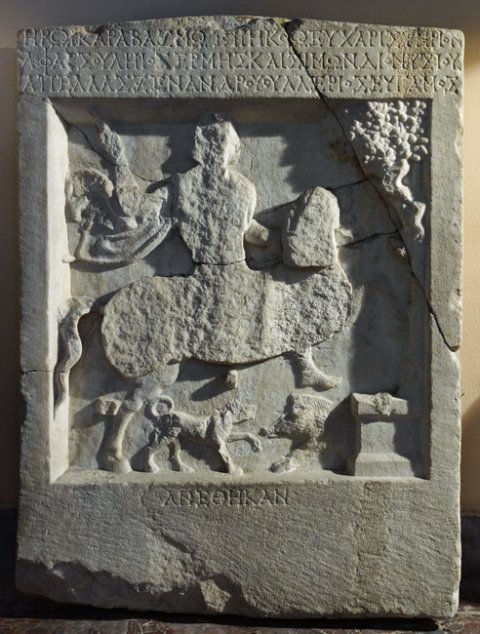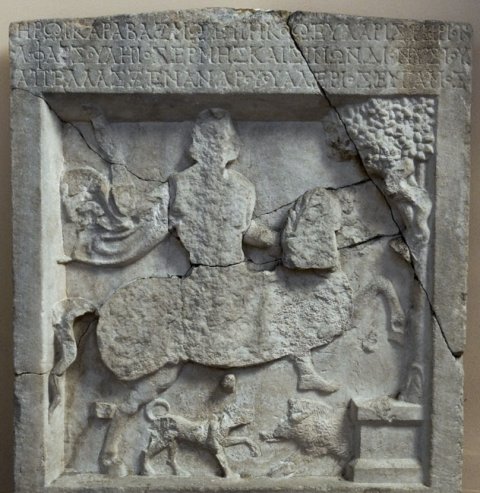 - Mythische Figur: Heros Karabazmos (Thrakischer Reiter), vor ihm Altar und Baum mit Schlange, unter dem Pferde Hund und Eber.