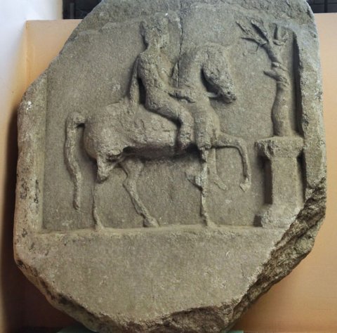 - Mythische Figur: Thrakischer Reiter, vor ihm Altar und Baum mit Schlange.