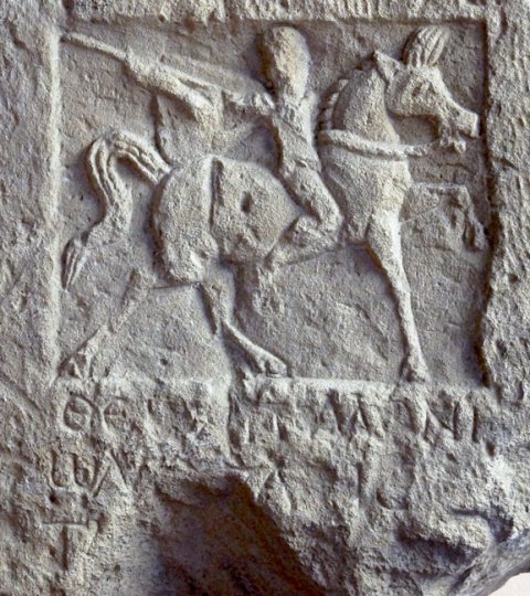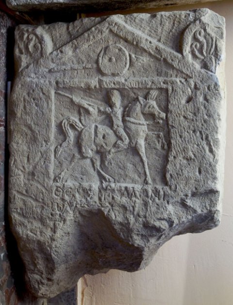 - Eingeschriebener Giebel mit Akroteren, im Giebelfeld Waffen (Schild, Speer). Eingetieftes Bildfeld mit Reiter mit erhobenem Speer in der Rechten.