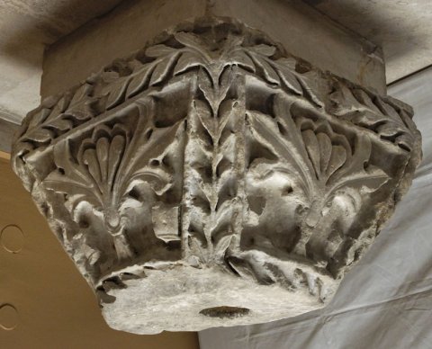 - Kämpferkapitell mit vier trapezförmigen Feldern, darin je ein großes Blatt. Rahmenleisten mit Blattstängeln, unten tordiertes Band.