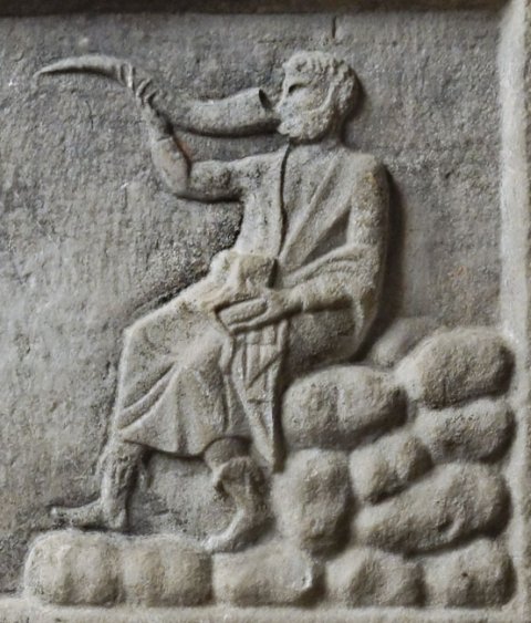 - Mythische Figur: auf Felsen sitzender bärtiger Heros in Mantel und Stiefeln, in der Rechten Trinkhorn, in der Linken Schale. Vor ihm drei Verehrer im Mantel.