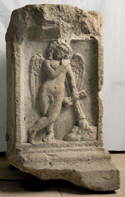 - Trauergenius mit langen Locken und ausgebreiteten Flügeln, der sich mit dem linken Arm auf Fackel stützt.