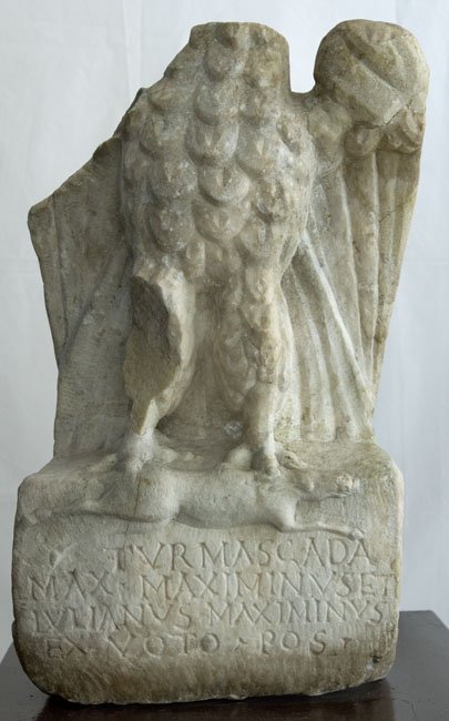 - Adler auf kubischer Basis mit Inschrift und darüber Relief einer hingestreckten Hirschkuh (?).