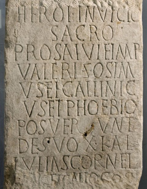 - Heroi invicto / sacro / pro salute Imp(eratoris) / Valeri Zosim/us et Callinic/us et Phoebio / posuerunt / de suo X kal(endas) / Iulias Cornel/ịọ et Katio co(n)s(ulibus)