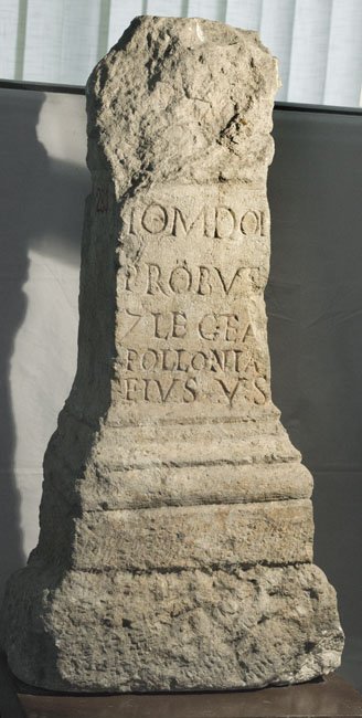 - I(ovi) O(ptimo) M(aximo) Dol(icheno) / Probus / c(enturio) leg(ionis) et A/pollonia / eius v(otum) s(olverunt)