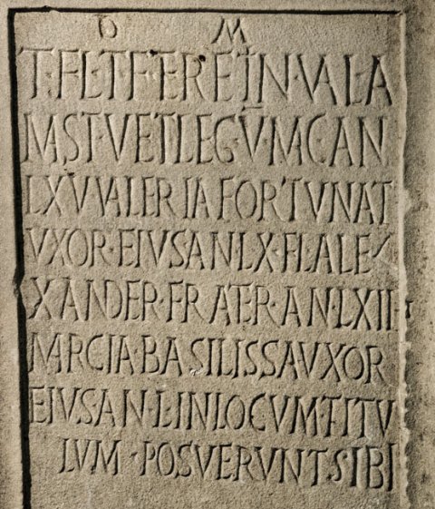 - D(is) M(anibus) / T(itus) Fl(avius) T(iti) f(ilius) Teretin(a) Val(ens) A/mast(ri) vet(eranus) leg(ionis) V Mac(edonicae) an(norum) / LXV Valeria Fortunat(a) / uxor eius an(norum) LX Fl(avius) Ale/xander frater an(norum) LXII / Marcia Basilissa uxor / eius an(norum) L in locum titu/lum posuerunt sibi