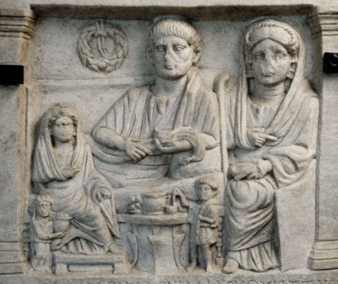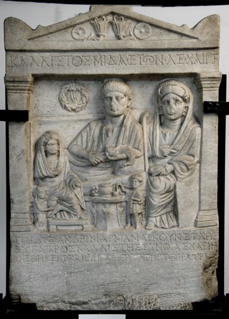 Totenmahl mit bartlosem Mann auf Kline, rechts Frau im Lehnsessel, links kleinere sitzende Frau mit Fußschemel. In der Mitte Tischchen mit Gefäßen, rechts davon Diener mit Schöpflöffel, ganz links Dienerin mit Gefäß. An der Wand Kranz mit Tänien. - Inschrift