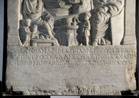 Κάλλιστος Μίδα ἐτῶν λεʹ χαῖρε·// τῷ ἰδίῳ ἀνδρὶ Μαρκία Μάρκου μετὰ τῆς / θυγατρὸς Καλλίστης εὐνοίας χάριν / ἀνέθηκεν τῷ ἀνδρὶ καὶ ἡ θυγάτηρ τῷ πατρί. - Errichter