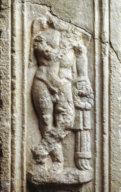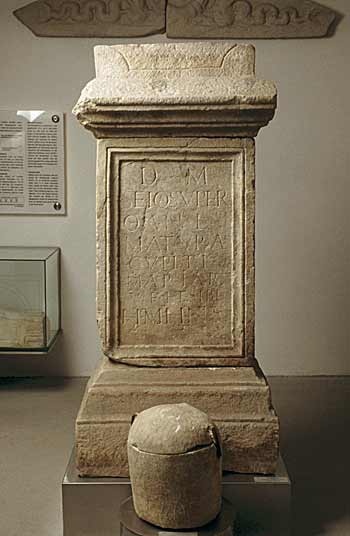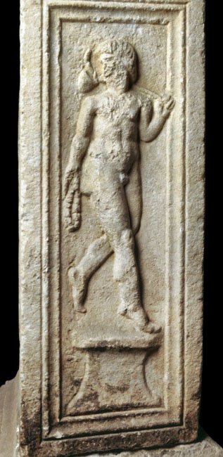 - Profilierter Aufsatz und Sockel. Auf der linken Nebenseite auf hohem Podest Trauergenius mit gesenkter Fackel, in der Linken Kranz. Auf der rechten Nebenseite mythische Figur: auf Podest nackter Satyr, in der Rechten Kranz, in der Linken geschultertes Pedum mit Korb.