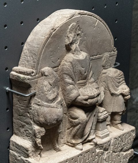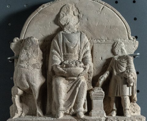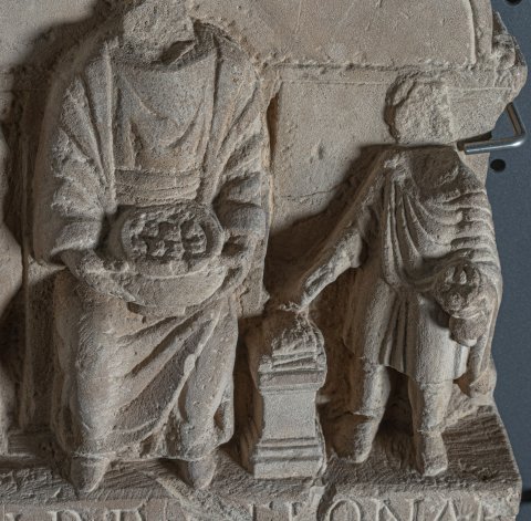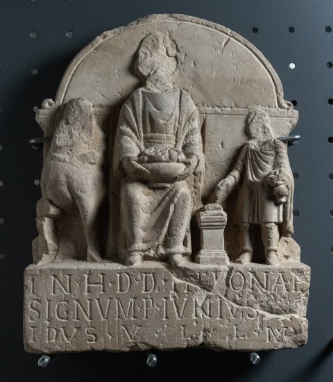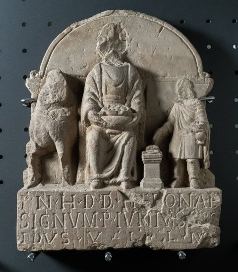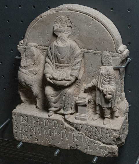 - Mythische Figur: thronende Epona mit Früchtekorb in den Händen. An ihrer rechten Seite Pferd, neben dem linken Fuß Altar, auf dem ein Mann in kurzer Tunica und Sagum opfert. Rückwand oben bogenförmig, seitlich Pilaster. Auf der Sockelleiste Weihinschrift.