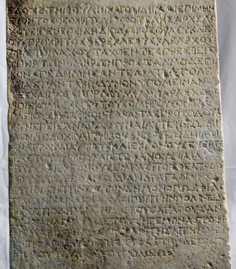ἔδοξε τῆι βουλῆι καὶ τῶι δήμωι· ἐπιμηνι/εύοντος Θεοκρίτου, Πυθοτέλης / Ἀρχελό/χου εἶπεν· ἐπειδὴ Διόδωρος Θρασυκλέ/ους, Πρόκριτος Φερεκλέους, Κλέαρχος / Ἀριστομάχου ταχθέντες πρέσβεις / ὑπὲρ τῶν ὁμήρων πρὸς Ζαλμοδεγι/κον ἀπεδήμησάν τε διὰ τῆς πολε/μίας πάντα κίνδυνον ὑπομείναν/τες καὶ πᾶσαν προθυμίαν παρασχό[με]/νοι ἐκομίσαντο τοὺς ὁμήρους, ὄντα[ς]