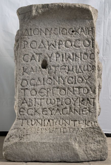 Διονύσιος καὶ Ἡ/ρόδωρος οἱ / Σατυρίωνος / καὶ Ἀρτεμίδωρ/ος Διονυσίου / τὸ ἔργον τοῦ / ἀβιτωρίου κατ/εσκεύασαν ἐκ / τῶν ἰδίων τῇ κώ/μῃ ὑπὲρ / μαγιστρά/της.