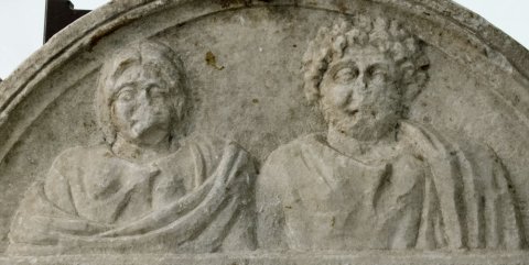- Inschrift zwischen kannelierten Pilastern, darüber Bogenfeld mit zwei Brustbildern (Ehepaar). Rechts bärtiger Mann mit Locken, Tunica und Mantel. Links Frau. Reste von Akroteren mit Halbpalmetten.