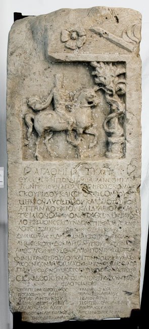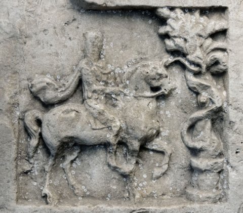 - Mythische Figur: eingeschriebener Giebel mit Rosette und Palmettenakroteren. Bildnische mit Thrakischem Reiter, vor ihm Baum mit Schlange und Rundaltar.