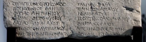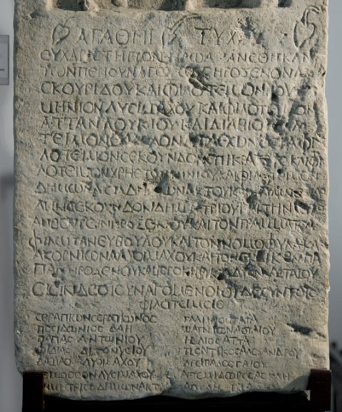 ἀγαθῆι τύχη̣ι̣· / εὐχαριστήριον Ἥρωα ἀνέθηκαν / τῶν περὶ συναγω[γ]ο̣[ὺ]ς Ἡρόξενον Δ[ιο]/σκουρίδου καὶ φιλότειμον Νου/μήνιον Λυσιμάχου καὶ φιλότειμον / Ἄτταν Λουκίου καὶ διὰ βίο[υ φ]ιλό/τειμον Θάλλον [Ἀ]γάθωνος καὶ φι/λότειμον Σεκοῦνδον Ἐπικράτους καὶ φι/λότειμον Χρῆστον Νικίου καὶ φιλότειμον / Δημώνακτα Δη[μ]ωνάκτου κα[ὶ ---] / δην Σεκοῦνδον Δημητρίου καὶ τὴν ἱερέ/αν Βούτειν Ἡροξένου καὶ τὸν γραμματέα / Φιλώταν Εὐβούλου καὶ τὸν νομοφύλακα / Ἀκορνίωνα Λυσιμάχου καὶ τὸν ἔκδικον Πα/πᾶν Ἡροξένου καὶ ἱεροκήρυκα Δῖον Ἀοταίου / εἰσὶν δὲ οἱ συναγόμενοι οἵδε σὺν τοῖς / φιλοτείμοις.Σεραπίων Σεραπίωνος / Ποσιδώνιος Δάη / Παπᾶς Ἀντωνίου / Φιδίας Διονυσίου / Δαμᾶς Λυσιμάχου / Τειμόθεος Λυσιμάχου / Δημήτριος Δημωνάκτου / [------ // Γαλη[ν]ὸς Ἄτα / Μαγνίων Ἀοταίου / Ἥλιος Ἄττα / Ποντικὸς Ἀλεξάνδρου / Ἀρείβαλος Γαΐου / Ἀρτεμίδωρος Ἀσκλη[πιάδου] /