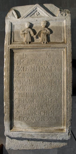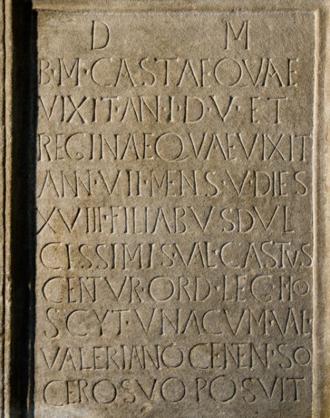 - D(is) M(anibus) / b(ene) m(erentibus) Castae quae vixit an(num) I d(ies) V et / Reginae quae vixit / ann(os) VII mens(es) V dies / XVIII filiabus dul/cissimis Val(erius) Castus / centur(io) ord(inarius) leg(ionis) I Iov(iae) / Scyt(hicae) una cum Val(erio) / Valeriano centen(ario) so/cero suo posuit