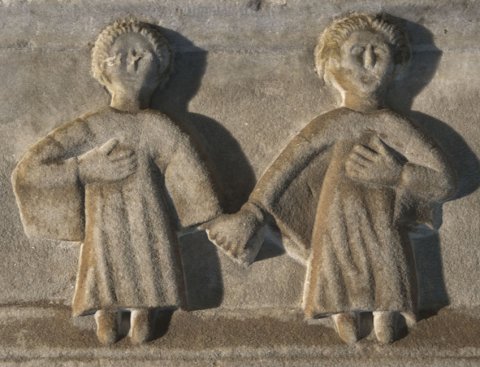 - Kleiner Giebel mit Rosette und Eckakroteren. Darunter querrechteckiges Bildfeld mit zwei stehenden Ganzfiguren (Kinder) in Ärmeltunica.