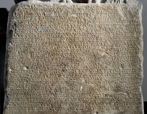 [ἐφ’ ἱέρ]ε̣ω Σαρ̣απ̣ίωνος [τ]οῦ Δ̣[ιοσκουρίδου ἄρχοντες] / [εἶπ]αν· ἐπειδὴ διὰ τὰς τῶν̣ κ̣αιρῶν περι̣[σ]τάσεις β̣[αρέως] / [ἀπ]ο̣ρῶν καὶ θλιβ̣όμενος ὁ δ̣ῆμος ἐν̣ τ̣ῆ[ι] μεγίσ̣τ̣[ηι καθέ]/[στ]η[κ]εν δυσελπιστίαι καὶ μάλιστα πάντων ἠ̣γ̣ω̣[νία]κε / ὑπὲρ τοῦ περιβόλου τῆς πόλεως, τῶν μὲν διὰ τὴν ἀπ[ο]/ρίαν ἐκλελοιπότων τὴν πόλιν, τῶν δὲ διὰ τὴν γενομένη[ν] / [λοι]μικὴν περίστασιν καὶ τὰς ἀῤ̣ῥωστίας μὴ δυναμένων / [φυ]λάσσειν τὴν πατρίδα καὶ διὰ ταῦτα ἐνβριθεστέρας κ[αὶ] / μείζονος φυλακῆς προσδεόμενος οἴεται δεῖν καταστ[ῆ]/[σ]αί τινας τοὺς ἀφηγησομένους καὶ φυλάξοντας τοὺς ἐ[πι]/καιροτάτους τῆς πόλεως τόπο̣υς· δεδόχθαι τῆ̣[ι] / β̣ουλῆι καὶ τῶι δήμωι ἑλέσθαι ἡγεμόνας ἐκ πάντων̣/ τ̣ῶν πολε̣ιτῶν ἤδη δύο, οἵτινες καταγράψουσιν ἄνδρ[ας] / ἐπιλέκτους τεσσαράκοντα τοὺς ἐφημερεύσοντα[ς] / [ἐ]πὶ τῶν πυλῶν καὶ παρακ̣οιτήσοντας τὰς νύκτας κ[αὶ] / ἐ̣φοδεύσ̣οντας τὴν πόλιν, ἕως ἂν βελτ[ε]ίονα κατάσ̣/τ̣α̣σ̣ιν παραγενηθεὶς ὁ δῆμος καὶ διαφυγὼν τοὺς πε[ρι]/εστῶτας κινδύνους ἀποδῷ τὰς ἀξίας χάριτας τοῖ[ς] / θ̣εοῖς· τοὺς δὲ αἱρεθέντας ἡγεμόνας ἐξουσίαν ἔχειν / ἀ̣ναγκάζειν καὶ ζημιοῦν ἑκάστης ἡμέρας ἀργυροῖς δέκ̣[α] / [κ]αὶ πράσειν {πράσσειν} τοὺς ἀπακτοῦντας, τρόπον ὃν ἂν δύνωνται̣,/ [ἀ]ζημίους ὄντας καὶ ἀνυποδίκους· δοθῆναι δὲ αὐτοῖς̣/ ὑ̣πὸ τοῦ δήμου κα[ὶ] εἰς ἀπαρχὴν καὶ σύνοδον χρυσοῦς / [τ]έ̣σσαρας· παραπραθῆναι δὲ αὐτοῖς ὑπὸ τῶν ἀρχόντων̣/ [ἐ]ν τῷ λιμένι τῶι ἐφ’ ἱέρεω Ἀριστοφάνου· εἱρέθησαν {Ἀπο} / Ἀπολλοῦς Νικηράτου, Ποσειδώνιος Γέροντος. // Μητρὶ Θεῶν καὶ Διοσκόροις· δεδόχθαι τῆι βουλῆι κα[ὶ] / τῶι δήμωι ἐπαινέσαι μὲν ἐπὶ τούτοις τοὺς ἡγεμόνας̣/ καὶ τοὺς ἐπιλέκτου[ς, ἀν]αγράψαι δὲ [τ]ά τε ψηφίσματα κ[αὶ] / τὰ ὀνόματα αὐτῶν ε[ἰ]ς τελαμῶνα λευκοῦ λίθου καὶ / ἀ̣ναθεῖναι ἐν ὧι ἂν προαιρῶνται τόπωι, ἵνα καὶ οἱ λο[ι]/ποί, εἰδότες τὴν εὐχαριστίαν τοῦ δήμου, φιλοτι/μότεροι γείνωνται εἰς τὸ διαφυλάσσειν τὴν / πατρίδα. // linke Kolumne: Ἀπολλοῦς Νικηράτου /