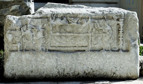- Totenmahl: Matratze und rechtes Bein einer Kline, davor eckiger Tisch mit Zwischenbrett, rechts und links Diener, links Anrichte und niedriges Tischchen mit Gafäßen.