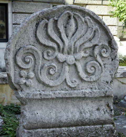 - Teil eines Geison, darauf Bogenfeld mit Palmette, Spiralranken und Rosette.