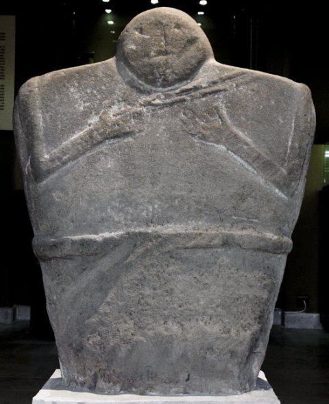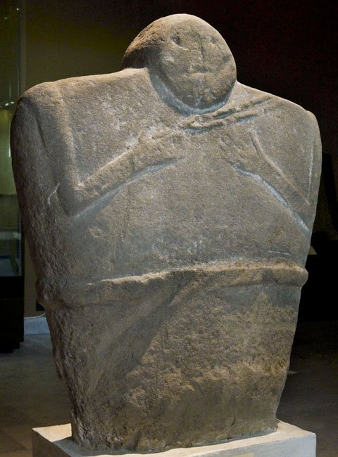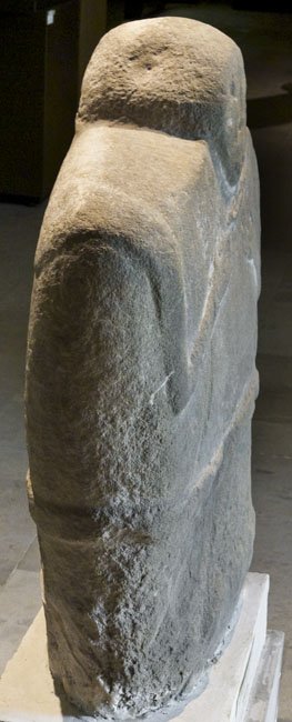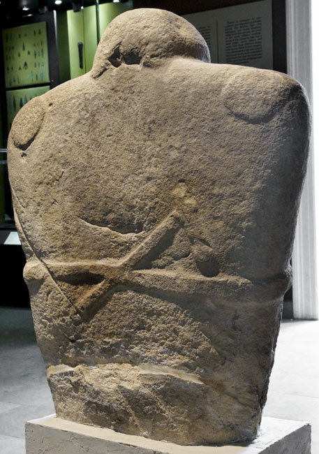 - Stehende Figur mit auf die Brust gelegten Händen und Gürtel, in dem auf dem Rücken ein Beil steckt. In der rechten Hand zwei Stäbe (?).