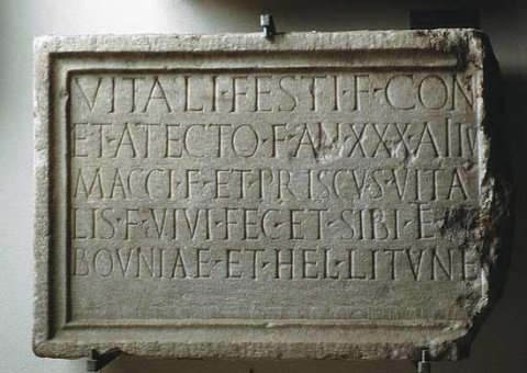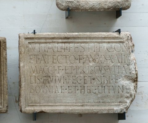 - Vitali Festi f(ilio) con(iugi) / et Atecto f(ilio) an(norum) XXX Aiu / Macci f(ilia) et Priscus Vita/lis f(ilius) vivi fec(erunt) et sibi et [Hel(viae)?] / Bouniae et Hel(viae) Litun(a)e
