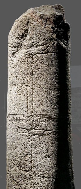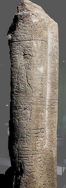 - Abgeflachte Säule mit eingravierten geometrischen Mustern, Gürtel, Dolch.