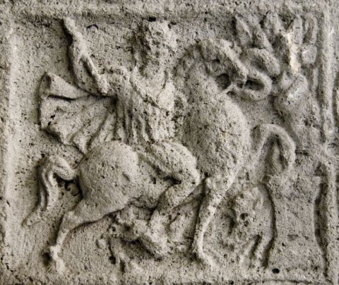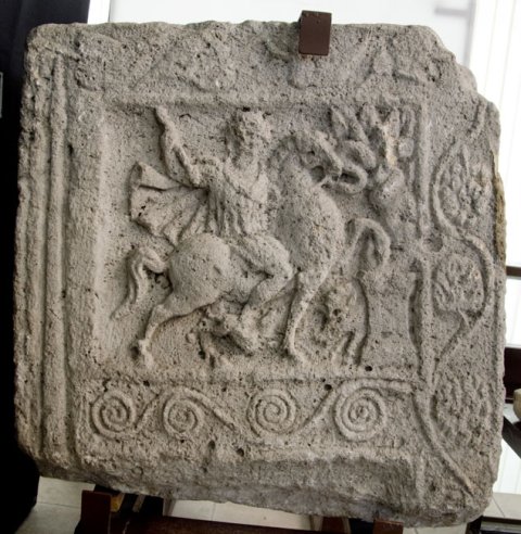 - Mythische Figur: Thrakischer Reiter, vor ihm Altar, Baum mit Schlange, Eber, unter dem Pferd Hund. Auf der Rahmenleiste unten Spiralranke, rechts Weinranke, links Waffen (Speere ?), unten Ansatz eines gerahmten Feldes.