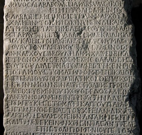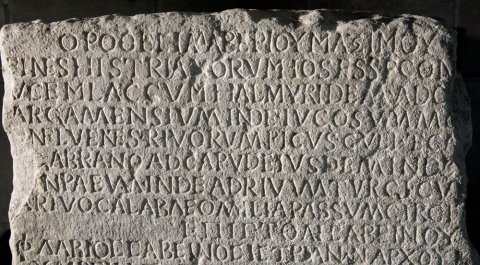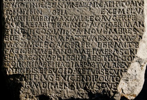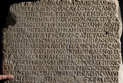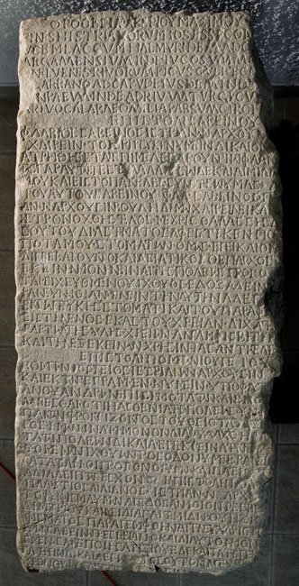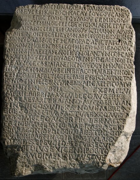 griechisch : ὁροθεσία Λαβερίου Μαξίμου ὑ[πατικοῦ] / fines Histrianorum hos esse con[stitui --- Pe]/ucem laccum Halmyridem a do[minio ---] / Argamensium, inde iugo summo [--- ad c]/[o]nfluentes rivorum Picusculi et Ga[brani, inde ab im]/[o] Gabrano ad capud eiusdem, inde [-- iuxta rivum] / [S]anpaeum, inde ad rivum Turgicu[lum ---] / a rivo Calabaeo, milia passum circi[ter D?XVI] / ἐπιστολὴ Σαβείνου / Φλάβιος Σαβεῖνος Ἰστριανῶν ἄρχουσ[ιν βουλῇ δήμῳ] / χαίρειν τὸ περὶ Πεύκην ὑμεῖν δίκαιο[ν ὅπως ἀκέραιον δι]/ατηρηθῇ, ἔσται ἐπιμελὲς Ἀρουντίῳ Φλάμ[μᾳ τῷ ἐπάρχῳ· οὕ]/τως γὰρ αὐτῷ ἐπέστε[ι]λα· λαλήσω δὲ καὶ Αἰ{μι}λι[ανῷ διαδόχῳ] / μου καὶ εἰς τὸ παντελὲς συνστήσω ὑμᾶς. ἄ[λλη ἐπιστολὴ] / τοῦ αὐτοῦ Σαβείνου. Φλά(βιος) Σαβεῖνος π[ρεσβευτὴς Ἰστρι]/ανῶν ἄρχουσιν βουλῇ δήμῳ χαίρειν· εἰ κα[ὶ τὸ τῆς κατὰ τὸν] / Ἴστρον ὄχθης τέλος μέχρις θαλάσσης δ[ιήκει καὶ ἐκ το]/σούτου διαστήματος ἀφέστηκεν ἡ πό[λις ἀπὸ τῶν τοῦ] / ποταμοῦ στομάτων ὅμως ἐπεὶ καὶ οἱ [πρέσβεις ὑμῶν] / διεβεβαιοῦντο καὶ Ἀσιατικὸς ὁ ἔπαρχος [ἔλεγε σχεδὸν] / ἐκείνην μόνην εἶναι τῆς πόλεως πρόσο[δον τὴν ἐκ τοῦ] / ταρειχευομένου ἰχθύος, ἔδοξα δεῖν [ὑμεῖν κατὰ τὴν ὑμετέ]/ραν συνήθιαν μένειν τὴν αὐτὴν ἄδει[αν τοῦ τε ἁλιεύειν] / ἐν τῷ Πεύκης στόματι καὶ τοῦ παραφ[έρειν τὴν δᾷδα] / εἰς τὴν ἑνὸς ἑκάστου χρείαν δίχα τέ[λους· περὶ] / γὰρ τῶν τῆς ὕλης χρείων ἀν{γ}αμφισβήτη[τα ἔχετε ὅρια] / καὶ τὴν ἐξ ἐκείνων χρῆσιν πᾶσαν τῷ τέλε[ι ἀνυπεύθυνον]./