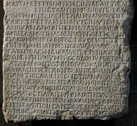 τὸ ψήφισμα ὑμῶν ἀπέδοσάν μοι οἱ ∙ πρέσβε[ις Καλλίστρατος] / Δημητρίου καὶ Μειδίας Ἀρτεμιδώρου. ἠξιο[ῦτε δὲ διὰ τοῦ ψη]/φίσματος παραπεμφθῆναι τὴν εὐχαριστο[ῦσαν τῷ τειμιωτάτῳ] / ἡμῶν Σαβείνῳ πρεσβείαν, ὃ καὶ δι’ αὐτὸν μόν[ον τὸν Σαβεῖνον ἀ]/σμένως ἂν ἐποίησα· ἠξιοῦτε δὲ καὶ τὰ τῆς Πεύ[κης ὑμεῖν ἄθραυσ]/τα τηρεῖν δίκαια· ἐγὼ δὲ τοσοῦτον ἀπέχ[ω τοῦ θραῦσαί τι τῶν ἐκ] / χρόνου φυλασσομέν[ων] ὑμεῖν [δικαίων, ὡς καὶ παρευρεῖν ἂν ἡδέ]/[ως] δι’ ὧν ἐ<νέ>σται κοσμεῖν ἀρχέαν πόλιν καὶ Ἑλληνίδ[α καὶ ἐς τὸν Σεβα]/[στ]ὸν εὐσεβῆ καὶ πρὸς ἡμᾶς αὐτοὺς οὖσαν εὐ[σεβῆ]./ ἐπιστολὴ Τουλλίου / Γεμίνου / [Τούλ]λιος Γέμινος πρεσβευτὴς καὶ ἀντιστρά<τη>γος [Τιβ(ερίου) Κλαυδί]/[ου] Καίσαρος Σεβ(αστοῦ) Γερμανικοῦ Ἰστριανῶν ἄρχουσ[ιν βουλῇ δήμῳ] / χαίρειν. οἱ πρέσβεις ὑμῶν Δημήτριος, Ἐσχρίων, Ωτα․․․, [Μειδίας] / Διονυσόδωρος, Ἡγησαγόρας, Ἀρισταγόρας, [Μητρόδωρος ἐν]/τυχόντες μοι ἐν Τόμει τὸ ψήφισμα ὑμῶν ἐπέδοσαν κα[ὶ τὴν εἰς τὸν Σεβασ]/τὸν ἡμῶν ἐπιδειξάμενοι εὔνοιαν συνήσθησαν ἐ[πὶ τῇ ἡμετέρᾳ ὑγεί]/ᾳ καὶ παρουσίᾳ σπουδεοτάτην <π>οιησάμενοι τ[ὴν περὶ ὧν ἐνετείλασ]/θε αὐτοῖς ὁμειλίαν· ἐπιγνοὺς οὖν ἣν καὶ πρὸς [ἡμᾶς ἐνεφάνισαν τῆς]πόλεως ὑμῶν διάθεσιν πειράσομαι ἀεί τινος ὑ[μεῖν ἀγαθοῦ] / γενέσθαι παραίτιος. περὶ δὲ Πεύκης καὶ τῶν στομ[άτων διδαχθε]/ὶς ὑπὸ τῶν πρέσβεων ὑμῶν ἐδικαίωσα τηρῖσθαι ὑμ[εῖν τὰ τῶν προ]/γόνων ὑμῶν ὅρια exemplum [decreti] / Ma<n>i Laberi Maximi leg(ati) Aug(usti) pr(o) pr(aetore) / [I]mp(eratore) Caesar<e> Traiano Aug(usto) German[ico III Iulio Fron]/tino III co(n)s(ulibus) VIII ka(lendas) Novembres [descriptum] / et recognitum factum ex comm(entariis) M[ani Laberi] / Maximi leg(ati) Aug(usti) pr(o) pr(aetore) permitte[nte ․․․] / Fabio Pompeiano. quae iam era<nt> scri[pta] / Charagonio Phi<l>o<p>alaestro con[ductori publici por]/