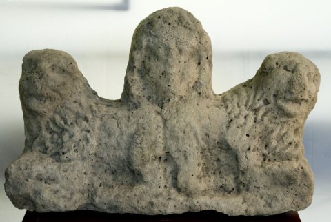 - Menschlicher Kopf mit langem Haar über zwei liegenden Löwen.