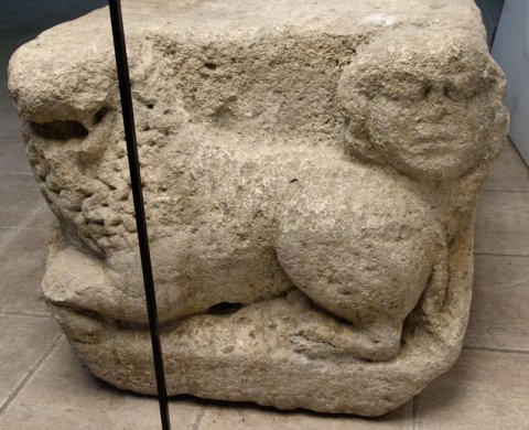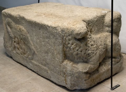 - Auf Vorder- und Rückseite zwei liegende Löwen, zwischen ihnen weiblicher Kopf (Gorgoneion ?). Auf der erhaltenen Nebenseite Mythos: Lupa Capitolina.