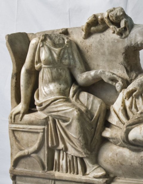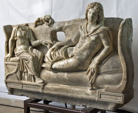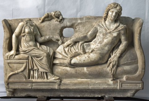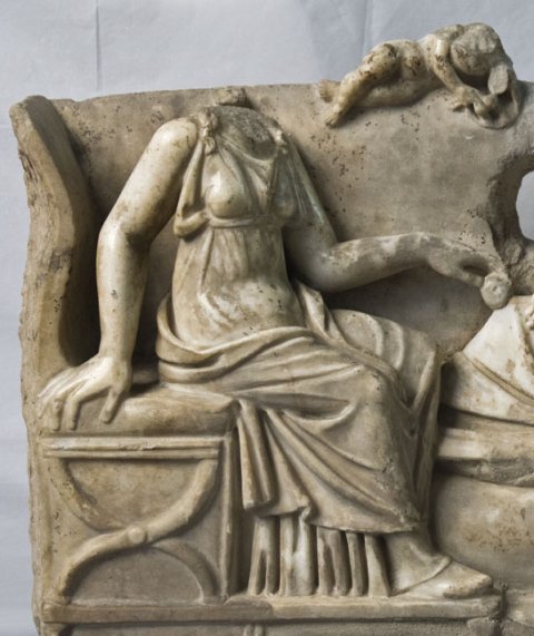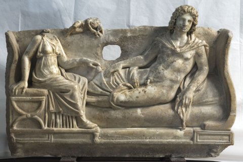 - Rundplastische Kline, darauf Jüngling mit langen Locken, Mantel um Schultern und Beine. Links auf Klappstuhl sitzende Frau in Chiton und Mantel, in der Rechten Frucht. Auf der Rückenlehne der Kline liegender Knabe (Erot ?).