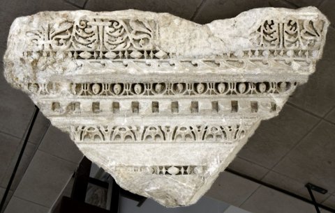 - Gesims (von unten: Astragalstab, Kyma, Zahnschnitt, Eierstab, laufendem Hund, Astragalstab, Palmettenfries)