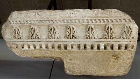 - Gesims (von unten: Zahnschnitt, Palmettenfries, tordiertes Band, Palmetten-Ranken-Fries)
