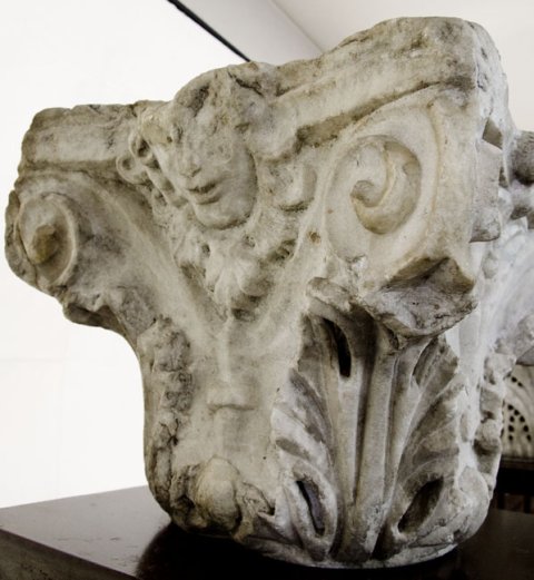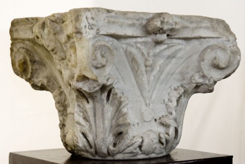 - Korinthisches Kapitell, zwischen zwei Voluten jugendliches Gesicht im Blätterkranz.