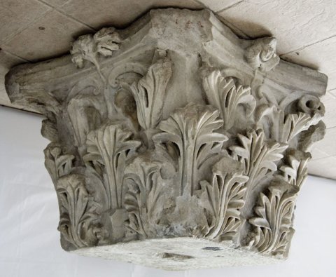 - Vierseitiges Pfeilerkapitell mit Akanthusblattkränzen, aus denen Volutenstängel wachsen.