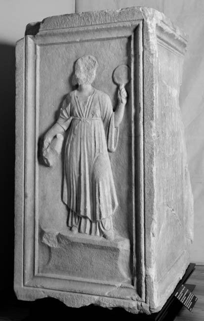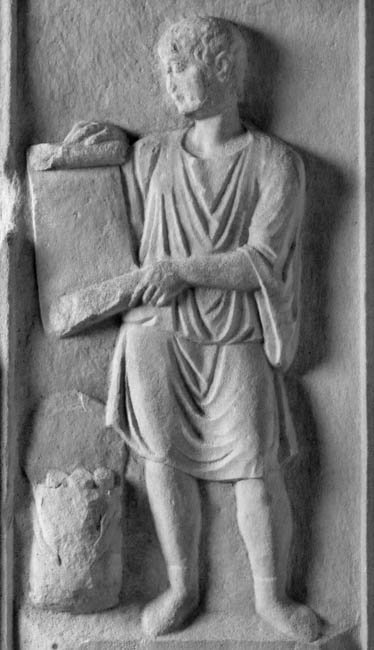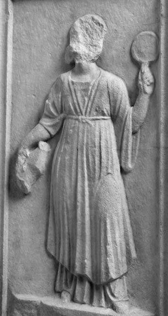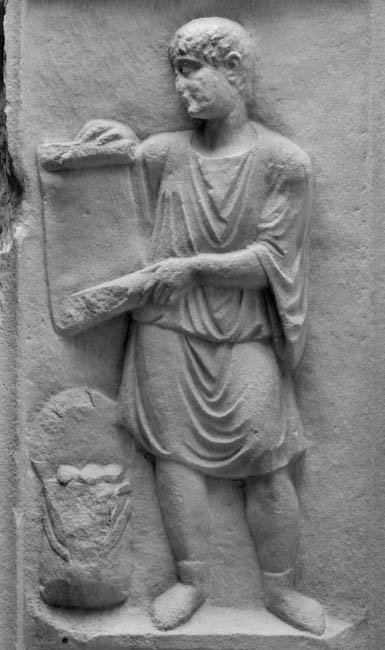 - Auf der linken Nebenseite Dienerin in einheimischer Tracht, in der Rechten Kanne, in der Linken Griffspiegel (patera ?). Auf der rechten Seite Diener (Librarius - Scriba) mit Rolle (volumen).
