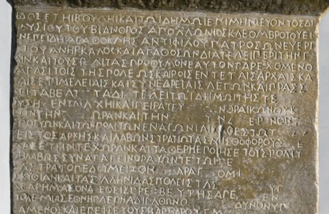 [ον]υσίου τοῦ Βιάνορος, Ἀπολλώνιος Κλεομβρότου εἶ[π]/[ε]ν· ἐπειδὴ Ἀγαθοκλῆς Ἀντιφίλου, πατρὸς ὢν εὐεργ/[έ]του, ἀνὴρ καλὸς καὶ ἀγαθὸς ὢν διατελεῖ περὶ τὴν π[ό]/λιν καὶ τοὺς π[ο]λίτας, πρόθυμον ἑαυτὸν παρεχόμενο[ς] / [ἐ]μ πᾶσι τοῖς τῆς πόλεως καιρ̣οῖς ἔν τε ταῖς ἀρχαῖς κα[ὶ] / ταῖς ἐπιμελείαις καὶ συνεδρ̣είαις λέγων καὶ πράσσ[ων] / ἀεὶ τὰ βέλτ[ισ]τα δι[α]τελεῖ τῶι δήμωι· τῆς τε [πόλεως] / οὔσης ἐν τα[ρ]αχῆι καὶ πειρατευ[όν]των Θραικῶν οὐκ [ὀλί]/γων τήν τ̣[ε χ]ώραν καὶ τὴν [πόλ]ι[ν], τ[ῶ]ν δ[ὲ θ]ερῶν ὄντ[ων] / [ὑ]πογύων καὶ τῶν πολιτῶν ἐν ἀγωνίαι καθεστώτ[ων], α[ἱρε]/[θ]εὶς τοξάρχης καὶ λαβὼν στρατιώτας μισθοφόρους [δι]ε[φύ]/λαξε τήν τε χώραν καὶ τὰ θέρη ἐποίησε[ν] τοὺς πολίτ[ας] / [ἀ]βλαβῶς συναγαγεῖν· Θραικῶν τε τῶν̣ πε[ρὶ] Ζ[ολτην με]/[τ]ὰ̣ στρατοπέδου μείζον[ος π]αραγ[ιν]ομέ̣[νων εἴς τε τὴν] / Σκυθίαν καὶ τὰς [Ἑ]λληνίδας πόλεις τὰς [τασσομένα]ς ὑπ[ὸ βασι]/λέα Ῥημαξον, α<ἱρ>εθεὶς πρεζβευτὴς /ἀπ̣ε[δήμησ]εν [διὰ τῆς]πολεμίας ἔθνη πλείονα διελθὼν ο[ὐδένα κίν]δυνον ὑπ[οστει]/[λ]άμενος καὶ ἔπεισε τοὺς βαρβάρ̣ους μ[ὴ μόν]ον [μὴ βιά]/σασθαι τὴν πόλιν ἡμῶν, ἀλλὰ καὶ [τὰ κ]τ̣[ή]ν[η τὰ πρ]ότε[ρ]ον ὑπ[ὸ πει]/ρατῶν συ̣[ν]απηγμένα τῶι̣ [δήμωι ἀποδοῦ]ναι [․․․ ὑπὸ Ζο]λτ[ην τε]/ταγμένων ἀναζητήσα[ν]τας [ἀνασῶισαι π]άντα· [κα]ὶ μ[ετὰ] / [τ]ούτων ἔσπευσεν αὐτοὺς / Γ[.......]ΕΙΣΙΑ[․]ΜΗ[․․]ΣΙ[․․] τὴν πόλιν δοῦναι πέντ[ε τ(άλαντα)? ὥ]στ[ε] συνθέσθαι πρὸς τὴν [πό]/λιν ὑπὲρ β̣ίου· μετὰ δὲ ταῦτα, ἐμβ[αλό]ν̣των αὐτῶν εἰς τὴν χ[ώρ]/αν καὶ Βιζώνην μὲν πολιορκούντων τήν τε χώραν πορθο[ύν]/των, τῶν δὲ θερῶν ἡμῖν ὄντων ὑπογύων, αἱρεθεὶ[ς] / πρεζβευτὴς καὶ ἀπο{ι}δημήσας ἐπὶ τὸ στρα[τό]/[π]εδον, τῶν πολιτῶν αὐτῶι πρόσταγμα δόντων κ̣[α]/τὰ τρόπον ἐξαγοράζειν τὴν χώραν καὶ τὰ θέρη, ἔπεισ[ε] / Ζολτην καὶ τοὺς Θρᾶικας, [ἀ]πὸ χρυσῶν ἑξ[ακ]οσίων μ[ὴ ἐμ]/[βα]λε<ῖ>ν εἰς τὴν χώραν μήτε ἐγγῖσαι τῆς πόλεως, δι’ [ὃ] συνέ[βη τοὺς] / [π]ολίτας [κ]υριεῦσαι πάντων [τ]ῶν ἀπὸ τῆς χώρας καρ̣[πῶν· πά]/λιν δὲ αἱρεθεὶς πρ[ε]ζ[β]ευτὴς εἰς τὴν Θράικην κα̣[ὶ πρὸς] / [τὸ]ν ἄρχοντα αὐτῶν Ζ[ολ]τη[ν], ἀ[νε]νεώσατ[ο] μ̣[ὲν] τὰ[ς γε]/[γε]νημένας ὁμολογίας καὶ συνθήκ̣[ας πρὸς α]ὐτούς· αἰσθόμεν/[ος] δὲ συναγωγήν τινα γινομένη[ν πειρ]ατῶν πλειό[ν]ων, ἐν[έ]/
