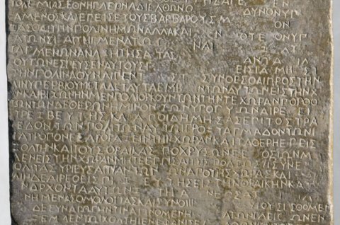 [δει]ξεμ μ̣ὲν τῶι Ζολτηι, ἐνεφάνισεν̣ [δ’ ἀνε]λθὼν καὶ τοῖς πολ[ί]/[ταις, δ]ι’ ὃ συνέβη τὴν ἐπιβουλὴν αὐτ[ῶν] ἄ[π]ρακτον [γ]ενέσ[θαι]·/ [παραβά]ν[τ]ων δὲ τῶν Θρ[αι]κῶν τοὺς ὅ[ρκ]ους καὶ τὰς ὁμο[λογίας] / [καὶ π]οιο[υ]μένων ἐπιδρομ[ὰς] συνεχε[ῖ]ς, αἱρεθεὶς ὑπὸ τοῦ [δή]/[μο]υ στρα[τη]γὸς ἐπὶ τῆς [χώ]ρας [αὐ]τοκράτωρ, λαβὼν τῶ̣[ν τε] / [π]ολιτῶν ἐ[θελ]οντὰς στρατιώτας καὶ τῶν συμφευγόν[των] / [β]αρβάρων ε[ἰς τὴ]ν̣ πόλιν, διετήρησεν ἀσφαλῶς τήν τε χώρα[ν] / [κ]αὶ τὰ κτήν[η καὶ τὰ] θέρη μέχρι τῆς διαβάσεως τῆς το[ῦ] / [βα]σιλέως Ῥη[μαξου]· διαβάντος τε τοῦ βασιλέως εἰς τὸ [πέ]/[ρα]ν, φυλακὴν δ[ὲ διὰ τὸ δέ]ος οὐ καταλιπόντος, ἀποστείλ[αν]/[το]ς δὲ ἀγγέλου[ς καὶ ἀπ]αιτοῦντος τὸν φόρον, τῆς χώρα[ς] / [οὔ]σης ἐμ πολέμωι, αἱρε[θεὶ]ς̣ πρεζβευτὴς καὶ ἀποδημήσα[ς] / [κα]τὰ πλοῦν, ἔπεισε τὸν [βασι]λέα Ῥημαξον δοῦναι εἰς [προ]φυλ[α]/[κὴν ἱ]ππεῖς ἑκα{ι}τόν · ἐφόδου δ[ὲ μ]είζονος τῶν Θραικῶν προσ/[πεσ]ο̣ύσης το[ῖ]ς προφύλαξιν κ[αὶ ἀ]ναχωρησάντων αὐτῶν /