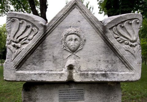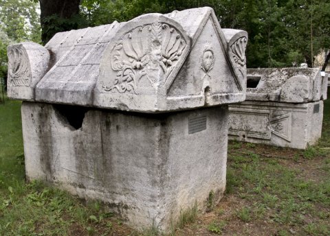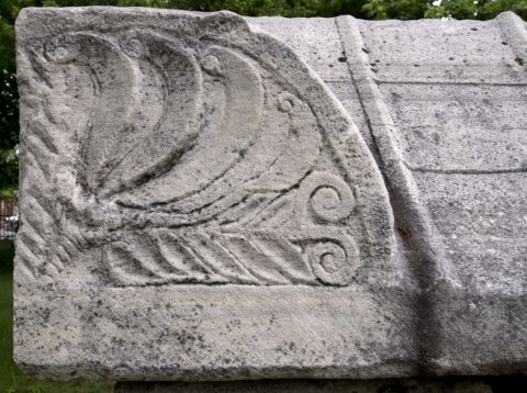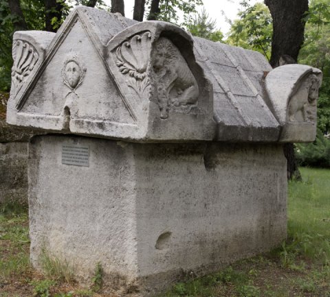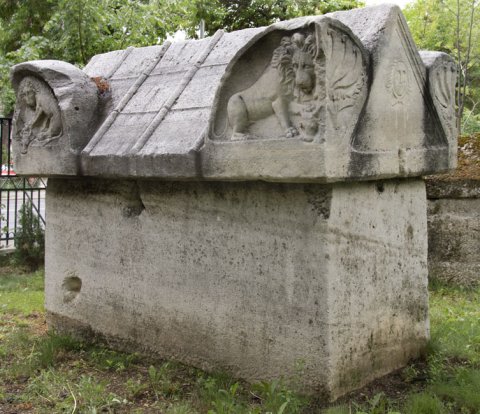 - Dachförmiger Deckel mit vier Eckakroteren. Auf der Langseite vorn Palmetten mit Ranken, auf der Rückseite Löwen über Stierköpfen, auf den Schmalseiten Palmetten. In den Giebelfeldern Gorgoneion. Undekorierter Kasten mit tabula ansata.